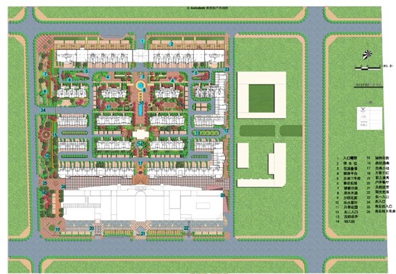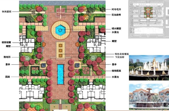 項目考慮“人、自然、空間”之間的和諧關系,堅持以人為本的設計理念,在設計中以生態(tài)環(huán)境優(yōu)先為原則,充分考慮建筑和景觀之間的關系,通過材料和造型的運用,將歐式建筑和新古典景觀進行風格樣式上的對接。在規(guī)劃的同時,輔以景觀設計,最大限度的體現居住區(qū)本身的底蘊。設計中結合當地特色,在小區(qū)中設置小區(qū)中心景觀軸線、橫向景觀帶、生態(tài)種植區(qū)等。在中心景觀軸線當中設置了歐式的矮墻噴泉、花溪疊瀑、下層廣場、噴泉水景等,使居民樂居其中。規(guī)劃設計注重園林景觀的可參與性,在小區(qū)內設置開闊的硬質景觀,如波紋鋪地、琴韻廣場等。小區(qū)內公共空間、私密、半私密空間如:下層廣場和健康步道兩者的公共性和私密性設計對比強烈,動靜結合。通過不同的景觀設計,也為小區(qū)居民提供空間上充足、多樣的休閑、交往、活動場地,營造和諧、友善、溫馨的人際關系氛圍。