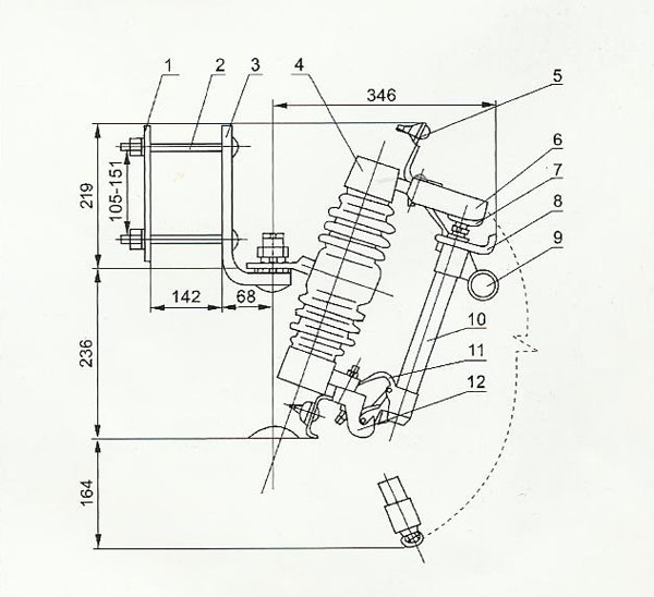 RW4跌落式熔斷器在正常運行時,熔絲管借助熔絲張緊后形成閉合位置。當系統發生故障時,故障電流時熔絲迅速熔斷,并形成電弧,消弧管受電弧灼熱,分解出大量的氣體,使館內形成很高壓力,并沿管道形成縱吹,電弧被迅速拉長而熄滅。熔絲熔斷后,下部動觸頭失去張力二下翻,鎖緊機械,釋放熔絲管,熔絲管跌落,形成明顯的開斷位置。當需要拉負荷時,用絕緣桿拉開動觸頭,此時主動、靜動觸頭仍然接觸,繼續用絕緣桿拉動觸頭,輔助觸頭也分離,在輔助觸頭之間產生電弧,電弧在滅罩狹縫中被拉長,同時滅弧罩產生氣體,在電流過零時,將電弧熄滅。